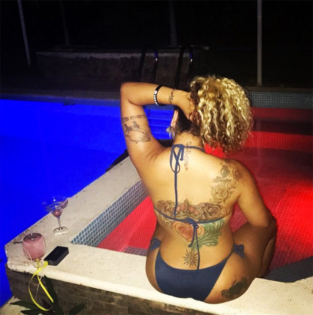 Tameka “Tiny” Harris, 42, isn’t afraid to show off a little skin on her Instagram account. The mother of five is slowly but surely becoming known for her bikini body, especially as she continues to post sexy pics for everyone to see. In her latest, Tiny takes sexy posing to a whole new level by showing just the back of her body as she sat on the edge of what appears to be a hot tub. Tiny is rocking a blue string bikini, and she is seductively holding her hair up to reveal her curves. Also revealed? The gorgeous back tattoo she has, which also runs up her shoulder into another design. So pretty.