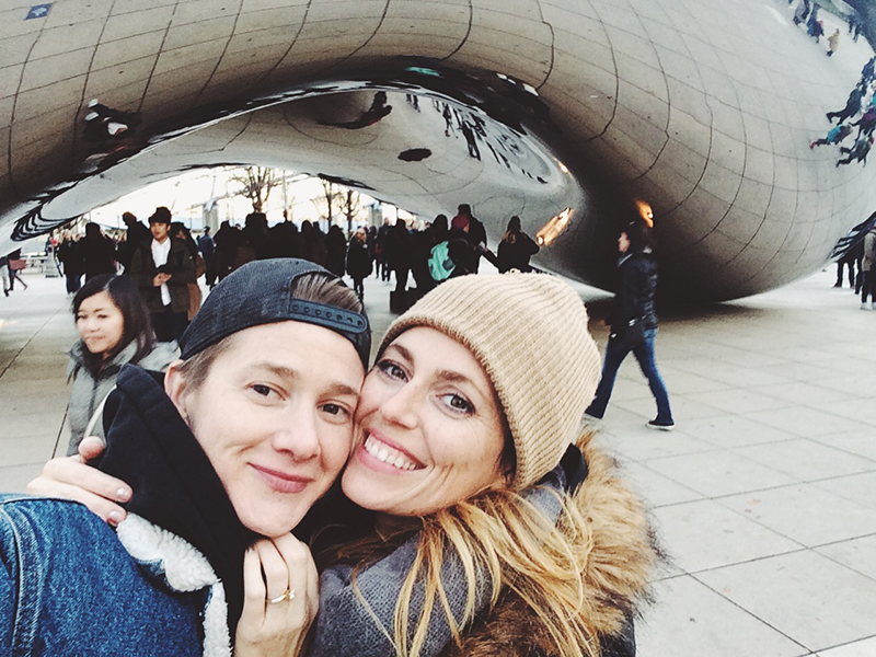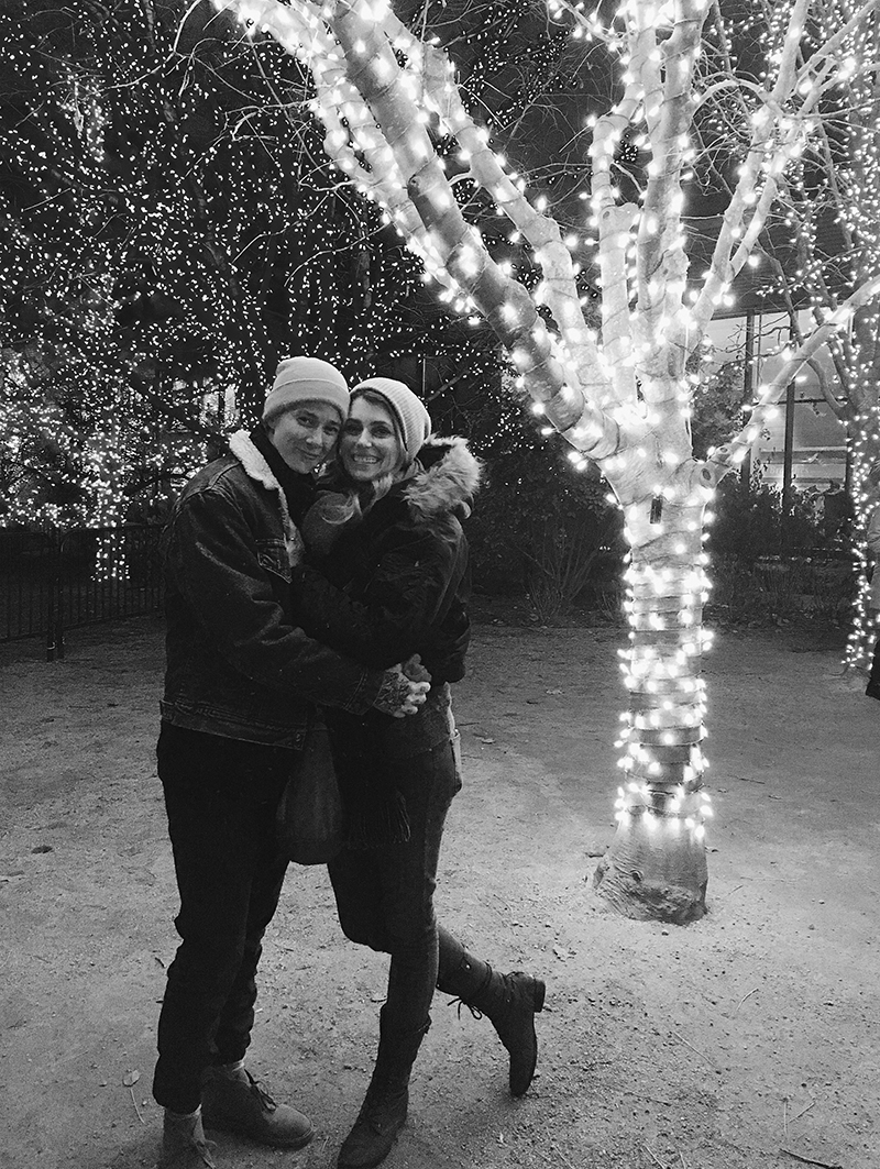“The last thing I saw coming was a proposal! Not because I didn’t want that or fantasize about marrying the love of my life, Mav, but because I am not the easiest person to surprise. I had to work in Chicago and it was the same weekend as Mav’s birthday, so I surprised her with a ticket and she came along with me. Of course, she was the one who ended up doing the majority of the surprising! She insisted we go to The Morton Arboretum which is outside of Chicago and walk around for their Christmas Illumination Ceremony. At first I was resistant, only because it was like 20 degrees and I’m a total baby in the cold. But I’m a sucker for anything Christmas related. So, we bundled up and walked around what felt like a magical elf-filled Christmas wonderland. I held onto hot cocoa while we walked arm in arm and tried to think warm thoughts. I noticed Mav was shaking, but I assumed she was shaking from the freezing temperature, little did I know it was actually from nerves. She kept trying to convince me to go off the trail, but I was like, ‘No way! We’ll fall into a ditch and freeze to death!’ A bit dramatic, yes, but safety first! Finally, she just pulled me off the path onto the grass and started to mumble about how much she loves me and my son Otis and wants to be a family and raise babies and so on. We’ve talked about this stuff before and she’s ‘jokingly proposed’ plenty since she is a comedian after all, so I had no clue she was being serious. Finally, she got down on one knee and other families walked by and I laughed and rolled my eyes assuming it was just another one of her silly jokes. Next thing I knew, she held up the ring and I have never felt so shocked. I think I froze. I honestly don’t even remember what happened next. I just kept laughing and asking, ‘Are you really serious?!’ over and over again. I’m still in shock to be honest. The ring is straight up out of a fairy tale. I’ve never been that into rings or jewelry even, but this one is just perfect for me. I can’t explain it, it just looks and feels right. Just like us. I feel as if this is what all the fuss has been about in movies and books and I never understood that until now. Mav is my true real-life love story. We walked around the Arboretum again, roasted marshmallows, and drank more hot cocoa while I continued to exclaim, “Oh my God, I can’t believe it,” and giggled non-stop. I feel so giddy, it’s as if the Christmas magic entered the proposal and the ring so every day feels like Christmas morning now. I hope the magic never fades, but with Mav as my partner, I don’t think it ever will.”