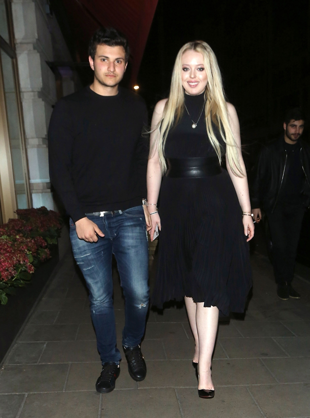 Two years of law school down, one to go! First Daughter Tiffany Trump just wrapped up her final exams at Georgetown Law late last week and jetted off across the pond for a trip to London with her boyfriend Michael Boulos. The 25-year-old donned a gorgeous black sleeveless dress with a high neckline and a large leather belt to show off her tiny waist as they left Novikov Restaurant and Bar in Mayfair on May 12. Tiffany wore her long blonde locks straight and parted down the middle and accessorized with a gold necklace with a simple round pendant and bracelets on both wrists.