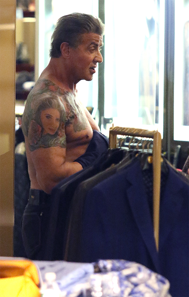 At 73-year-old, Sylvester Stallone is probably in better shape than most men half his age. The Rambo: Last Blood star put his muscles on display during a shopping trip in New York City on Wednesday, Sept. 18. The Hollywood icon was spotted trying on a leather jacket and a selection of shirts, which prompted Sly to get half-naked. After ditching his shirt, the world got an eyeful of his impressive tattoos. He has a massive piece across his back that wraps around to his pecs.
