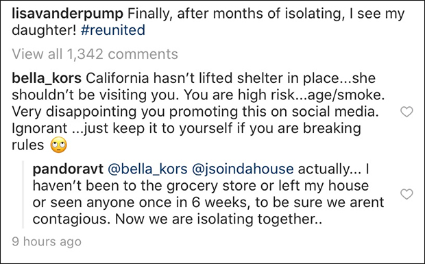 “California hasn’t lifted shelter in place,” the person commented on Lisa’s post. “She shouldn’t be visiting you…you are high risk…age/smoke. Very disappointing you promoting this on social media. Ignorant…just keep it to yourself if you are breaking rules.” Lisa caught wind of the comment, and issued a response to the hater. “Actually…I haven’t been to the grocery store or left my house or seen anyone for 6 weeks, to be sure we aren’t contagious” Lisa fired back. “Now we are isolating together…”