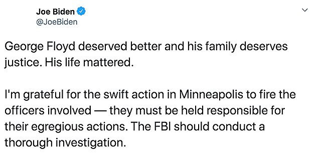 Presumptive Democratic presidential nominee Joe Biden weighed in on George’s death. “George Floyd deserved better, and his family deserves justice. His life mattered.” U.S. Senator Kamala Harris also called for justice. “Here’s the sad reality: what happened to George Floyd, Ahmaud Arbery & Christian Cooper has gone on for generations to Black Americans. Cell phones just made it more visible. Dismantling systemic racism in our nation starts with demanding justice & holding offenders accountable.”