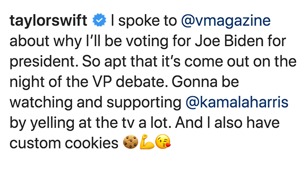 “So apt that it’s come out on the night of the VP debate. Gonna be watching and supporting [Kamala Harris] by yelling at the tv a lot. And I also have custom cookies.” The second snap in Taylor’s post, which you can see below, featured nearly a dozen Biden/Harris 2020 cookies she made herself! But even better than her rousing endorsement and her sweet cookies was the reason behind why Taylor has chosen to back the Democratic nominee.