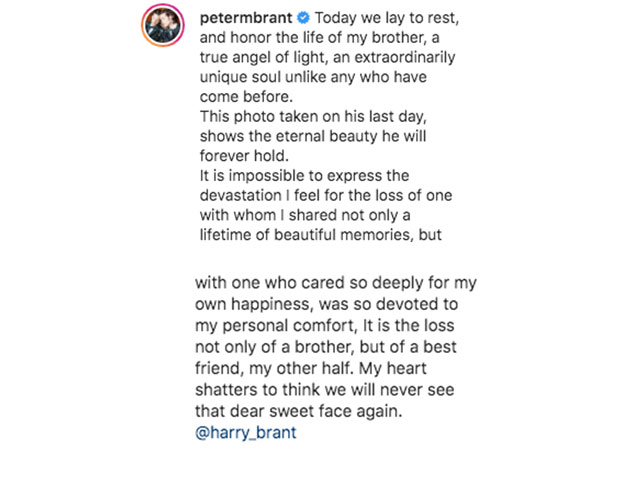 Update 01/22/21: “Today we lay to rest, and honor the life of my brother, a true angel of light, an extraordinarily unique soul unlike any who have come before,” wrote Peter Brant II on Thursday, Jan. 21. Peter II, 27, shared a photo of Harry laying on the floor next to socialite Gaïa Jacquet-Matisse, and memorialized his brother in the Instagram post’s caption. “This photo taken on his last day, shows the eternal beauty he will forever hold. It is impossible to express the devastation I feel for the loss of one with whom I shared not only a lifetime of beautiful memories, but with one who cared so deeply for my own happiness, was so devoted to my personal comfort, It is the loss not only of a brother, but of a best friend, my other half. My heart shatters to think we will never see that dear sweet face again. @harry_brant”