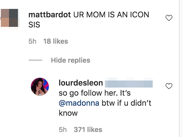 User @mattbardot commented, “not u thirst trapping…. what would ur mom think” referring to the 62-year-old singing superstar. Lourdes fired back, “@mattbardot does your mom know u don’t wash ur a**?” That didn’t offend the fan at all, who instead responded, “OMG IM FRAMING THIS” about his interaction with Madonna’s oldest child. He later commented in Lola’s second post, writing, “UR MOM IS AN ICON SIS” and she clapped back, “@mattbardot so go follow her. It’s @madonna btw if u didn’t know.”