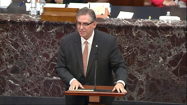 Bruce Castor, an attorney for former President Donald Trump speaks during Trump’s the second impeachment trial before the Senate at the U.S. Capitol. His performance was so lackluster it was compared to the public defender in ‘My Cousin Vinny.’ Photo credit: Senate Television/AP.