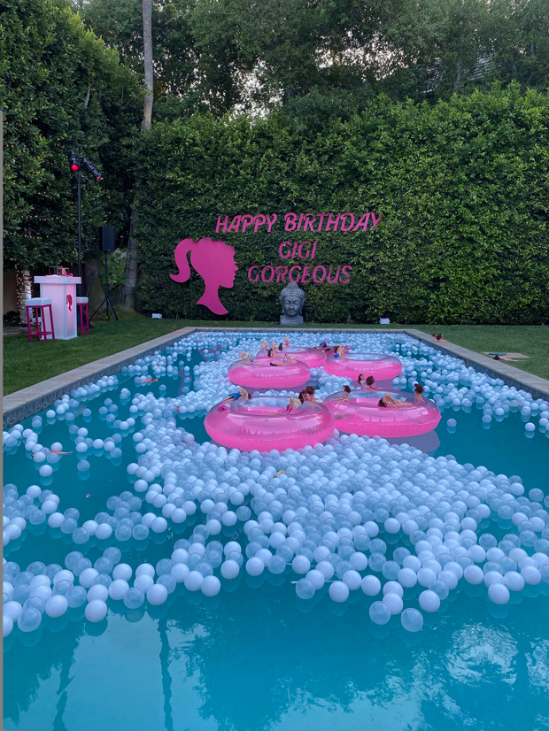 The night was filled with so many exciting details and moments like when her good pals Gotmik and Meatball took the stage and created special memories for her to hold on to. “I actually had drag performances,” Gigi said. “My friend Rhea Litre’, I don’t know if you guys have heard of her. She’s WeHo’s best drag queen. She’s literally one of my favorites. We had Kimora Black perform. We had Meatball perform. Aurora Sexton. Meatball went after her performance which I think was Barbie Girl, she went in the pool, full drag, full hair, full makeup. She went backwards in the pool on a floatie and her hair fell off and it was a moment. I was dying laughing. I could not catch my breath.”
