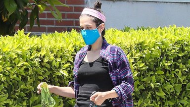 She was also noticeably not wearing an engagement ring but did wear a turquoise blue face mask as she held onto the leashes and what appeared to be a small paper bag to pick up the dogs’ droppings. Her long locks were pulled up into a high twisty bun and she appeared relaxed during the casual stroll.