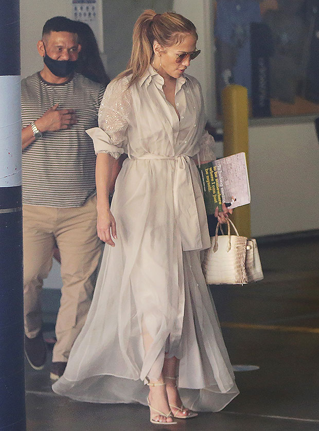 The pricey purse paired perfectly with her nude colored button-down dress. The gorgeous, flowy ensemble appeared to feature sequin embellishments on the shoulder along with a tie closure. She added beige colored sandals to the look along with a pair of wire sunglasses, keeping her highlighted hair pulled back into her signature, high ponytail. Jennifer also appeared to be holding an information package about the school as she strolled around outdoors.