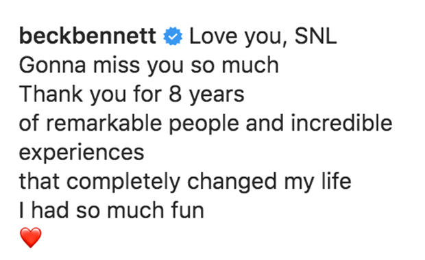 “Love you, SNL,” Beck wrote. “Gonna miss you so much. Thank you for 8 years of remarkable people and incredible experiences that completely changed my life. I had so much fun.” Some of Beck’s memorable moments included the finale of his first season, time spent with the team who helped him get ready for each show, seeing the audience at the end of the show and being in the writer’s room before Saturday morning meetings.