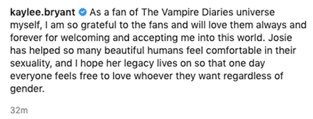 “As a fan of The Vampire Diaries universe myself, I am so grateful to the fans and will love them always and forever for welcoming and accepting me into this world. Josie has helped so many beautiful humans feel comfortable in their sexuality, and I hope her legacy lives on so that one day everyone feels free to love whoever they want regardless of gender,” Kaylee wrote.