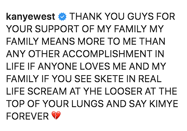 While Ye said it was all love in that post, he wrote something different an hour before it went up. “Thank you guys for your support,” he wrote, again in all-caps like he was spelling out MADVILLAIN’s name. “My family means more to me than any other accomplishment in life. If anyone loves me and my family, if you see Skete [Pete Davidson] in real life, scream at [the] looser(sic) at the top of your lungs and say ‘Kimye Forever.’”