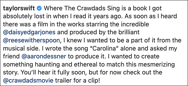 Taylor shared the trailer on Instagram and wrote, “Where The Crawdads Sing is a book I got absolutely lost in when I read it years ago. As soon as I heard there was a film in the works starring the incredible @daisyedgarjones and produced by the brilliant @reesewitherspoon, I knew I wanted to be a part of it from the musical side. I wrote the song ‘Carolina’ alone and asked my friend @aarondessner to produce it. I wanted to create something haunting and ethereal to match this mesmerizing story.”