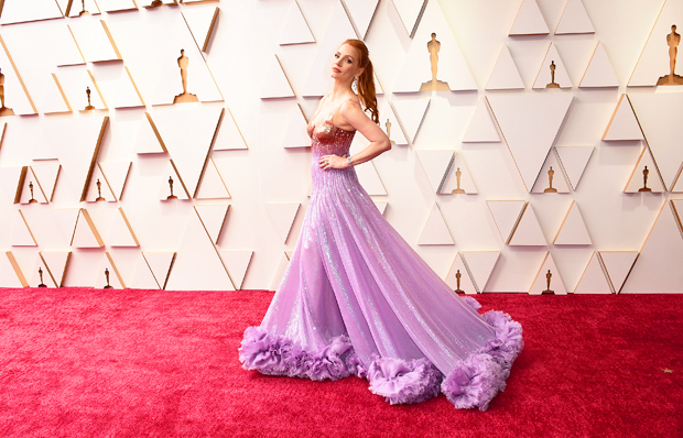 Jessica Chastain is a winner no matter what. The 44-year-old, who is nominated in the Best Actress category for The Eyes Of Tammy Faye, arrived at the Oscars in a breathtaking Gucci dress on Sunday, March 27. The ombrée colored dress was all Mermaid vibes, starting with a bronze, sleeveless bodice before fading into a jaw dropping lavender colored skirt that included a dramatic ruffle detail at the bottom.