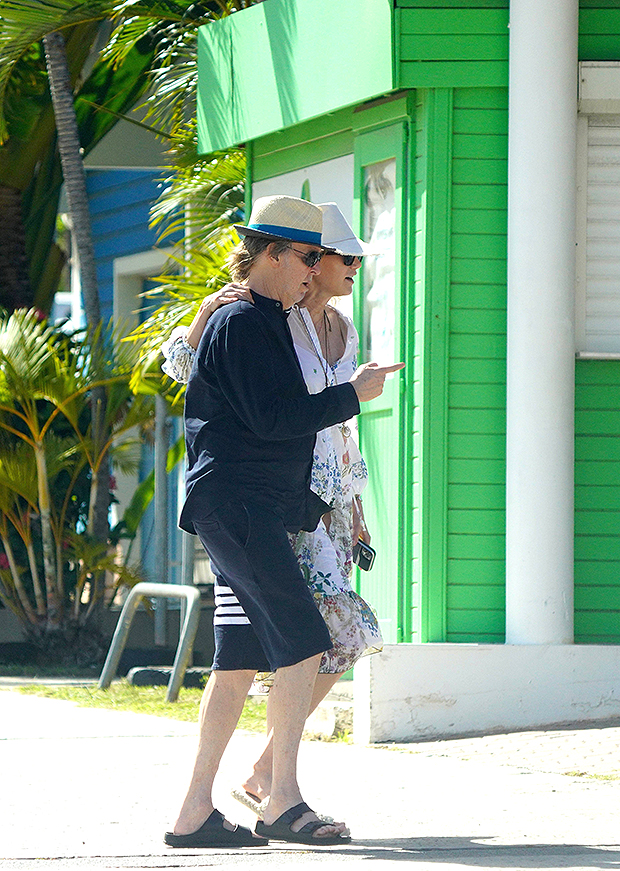 Days before this stroll, Sir Paul and Nancy went for a spring break swim. Both the Beatle and his wife wore long-sleeved swim shirts. Paul paired his with swim trunks that featured a blue and white print, while Nancy opted for a simple pair of black shorts. Despite it being Springtime in the northern hemisphere, temperatures in St. Barts were around the low 80s, making this dive into the crystal blue waters all more refreshing.