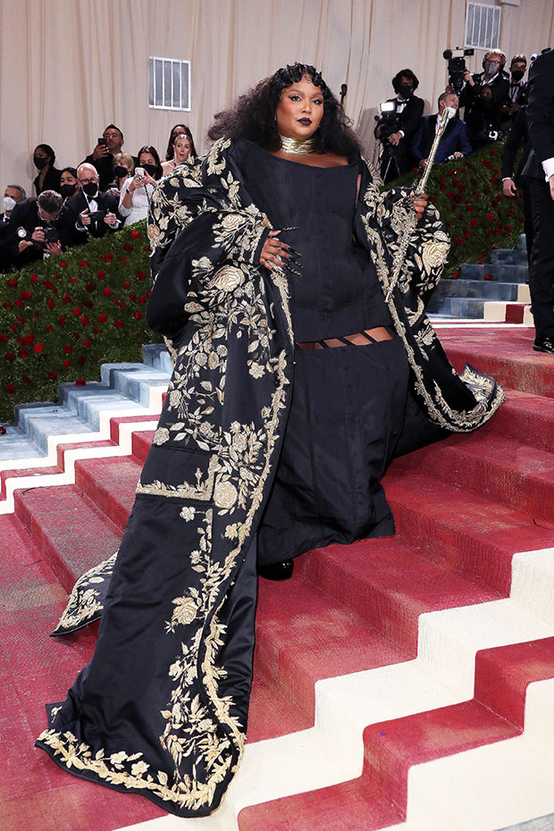 Can someone find Lizzo‘s throne?! The songstress strutted up to the Met Gala in style rocking a regal look that absolutely fit the theme of the event! In an outfit designed by Thom Browne, Lizzo stunned in a luxe black gown, which was topped with an intricately designed gilded gold and black robe that featured a massive train. The “Good As Hell” singer wore her hair in full, teased curls and rocked embellished long black and gold nails to match the ensemble.