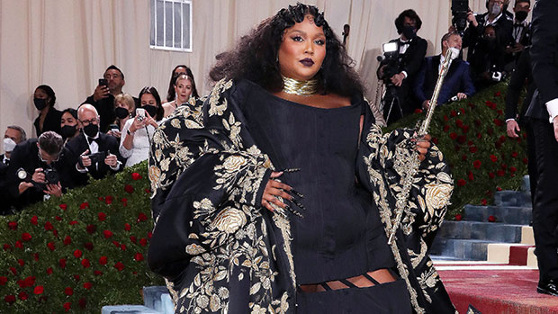 Can someone find Lizzo‘s throne?! The songstress strutted up to the Met Gala in style rocking a regal look that absolutely fit the theme of the event! In an outfit designed by Thom Browne, Lizzo stunned in a luxe black gown, which was topped with an intricately designed gilded gold and black robe that featured a massive train. The “Good As Hell” singer wore her hair in full, teased curls and rocked embellished long black and gold nails to match the ensemble.