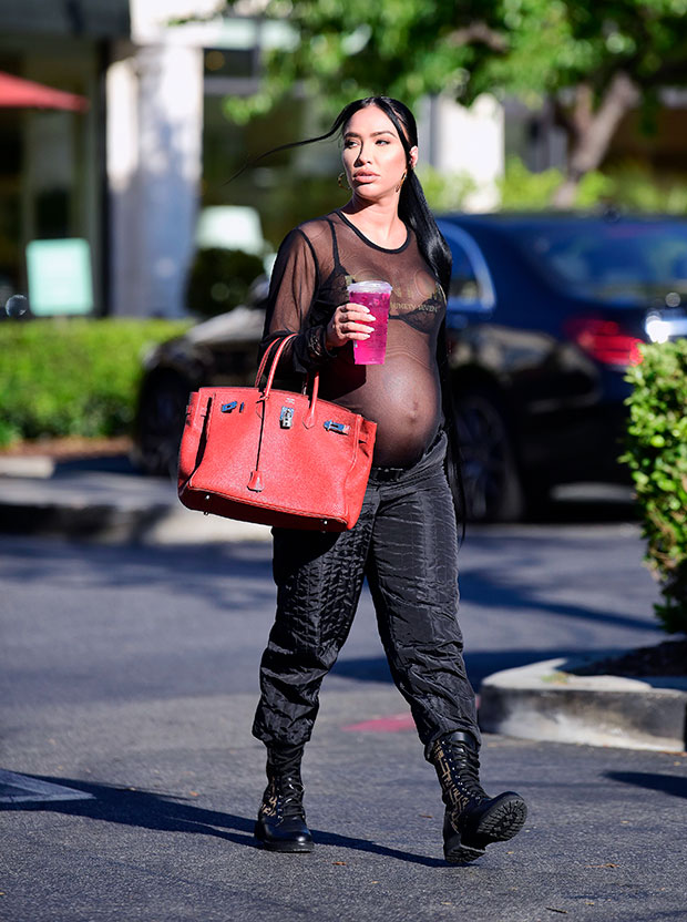 Nick Cannon will have enough kids to run his own Starbucks franchise when it’s all said and done, so whenever Bre Tiesi needs a cold drink, she won’t have to go far. Until that day comes, Bre, 31, will have to get her Mango Dragonfruit Lemonade – or whatever she was drinking when she was spotted Monday (June 6) – herself. The woman carrying Nick’s eighth child hit up a Starbucks in Calabasas while out with a friend. The model and real estate agent wore a mesh top that showed off every inch of her growing baby belly. The real estate agent also sported a black bra underneath and paired the top with some chic combat boots and a pair of black pants.