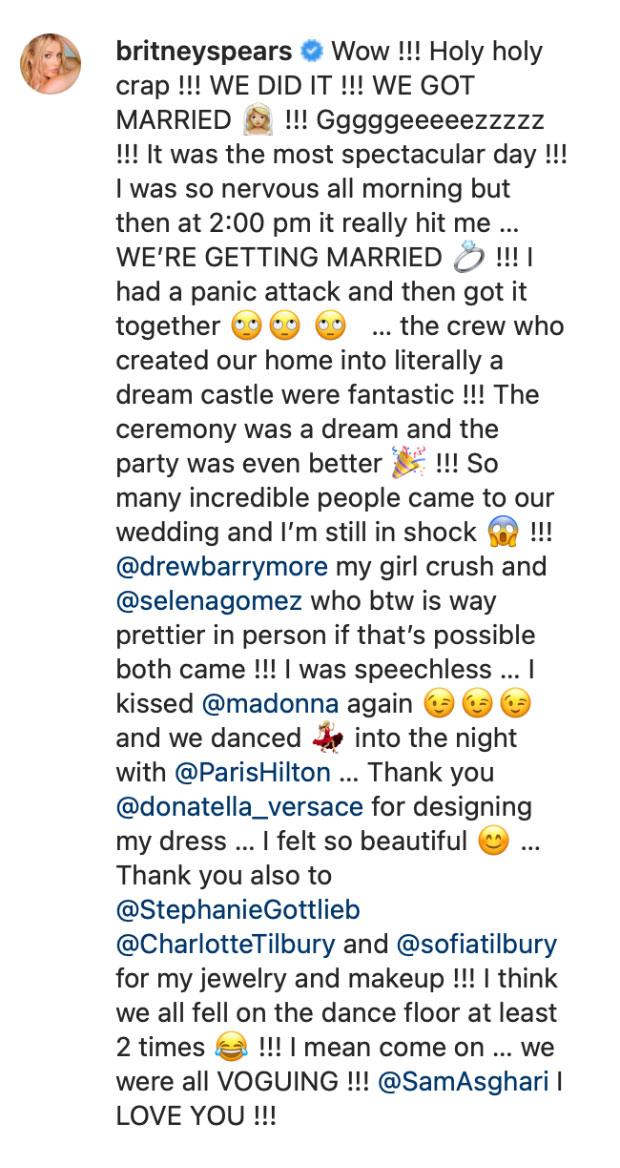 Britney Spears, 40, revealed she had a “panic attack” before her wedding to Sam Asghari, 28! The pop star took to Instagram to share a slew of photos from her June 9 nuptials in California, along with an emotional caption that revealed her feelings about the long awaited day. “Wow !!! Holy holy crap !!! WE DID IT !!! WE GOT MARRIED!!! Gggggeeeeezzzzz !!! It was the most spectacular day !!!” she wrote for her 41 million followers.