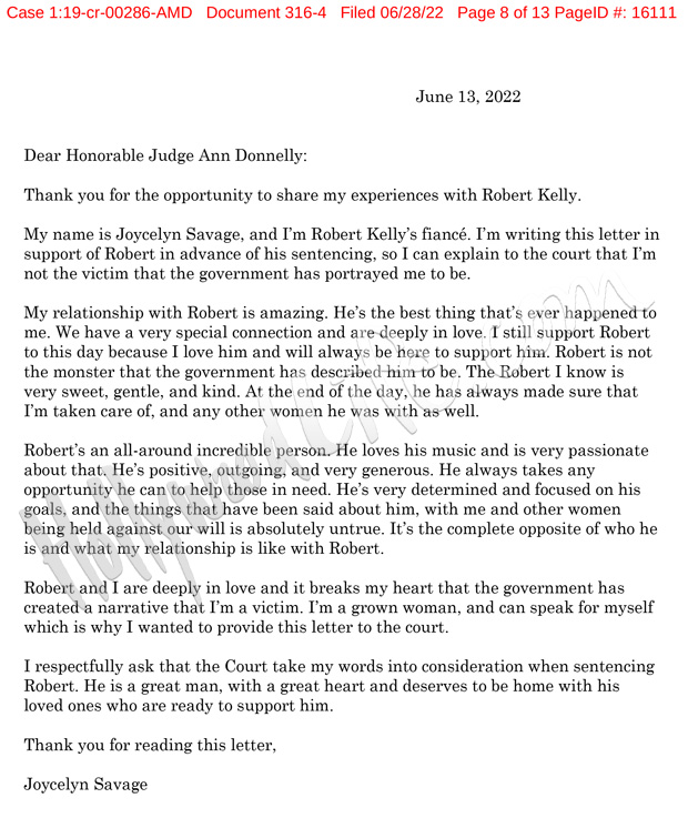 “We have a very special connection and are deeply in love,” she wrote. “I still support Robert to this day because I love him and will always be here to support him. Robert is not the monster that the government has described him to be. The Robert I know is very sweet, gentle, and kind. At the end of the day, he has always made sure that I’m taken care of, and any other women he was with as well.” Joycelyn went on to describe R. Kelly as “incredible” and “positive, outgoing, and very generous.”