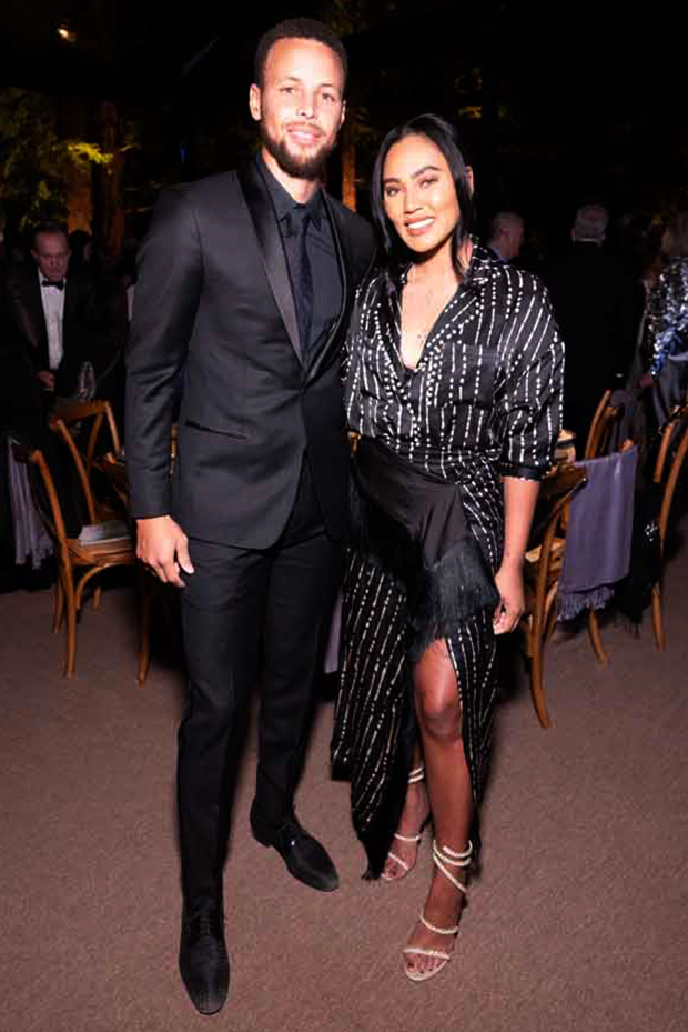 he dress featured black spaghetti straps and black material around her bust and waist before elegantly flowing into a wispy masterpiece. Ayesha wore her hair down in loose curls and accessorized with dangling diamond earrings, a bracelet, and her sparkling wedding rings (which complemented the Tiffany & Co. fashion jewerly that Steph wore that night.) Ayesha finished her stunning look with strappy silver heels that were covered in shining jewels.
