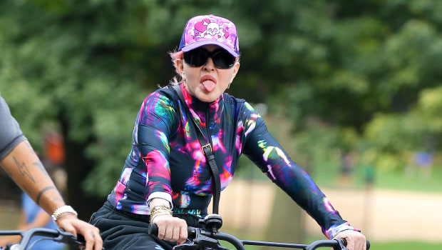 It’s Madonna’s world and we’re just living in it! The Material Girl was spotted back in New York City on Friday, August 26 after a whirlwind trip to Sicily to celebrate her 64th birthday. Rocking a colorful spandex top, flower-graphic jogger pants and a skull baseball cap, Madonna enjoyed a bike ride in the Big Apple with some friends. To prove she’s the one and only queen, the “Like A Virgin” hitmaker stuck out her tongue in a playful mood.
