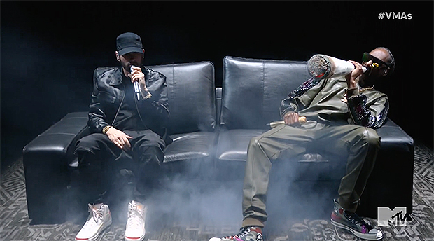 Neither Eminem or Snoop are strangers to the VMAs. “The Real Slim Shady” rapper has won 13 Moonmen over the past 23 years. Em took home his first award in 1999 for Best New Artist, and his most recent win was in 2014 with Best Editing for “Rap God.” The performance with Snoop is a perfect full-circle moment, as he made his first performance with Snoop and Dre at the 1999 show, performing a medley of songs including “My Name Is”, “Guilty Conscience”, and “Nuthin’ But A G Thang.”