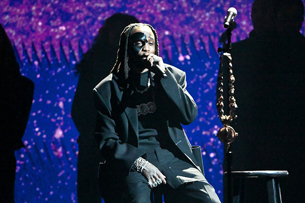 Quavo sported a black theatrical mask as he sat in front of a projection of Takeoff. Other musical icons who have passed were shown behind Quavo during the in-memoriam segment, including Stephen “tWitch” Boss. An empty stool was also placed next to Quavo with Takeoff’s chain around the microphone. At the end of the performance, Quavo held the chain up in tribute to Takeoff.