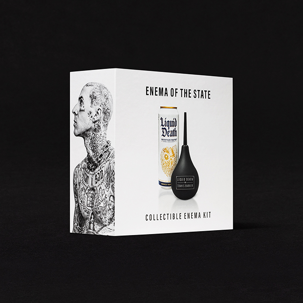 While the Liquid Death x Travis Barker: Enema of the State enema kit is real and is for sale (for $182), it’s not intended for use as an actual medical device. The commercial clarifies that it should “never be placed in or near your butthole without consulting a doctor first.” However, the kit – which comes with a limited edition enema bulb – comes with a 19.2 oz can of Liquid Death Mountain Water autographed by Travis.