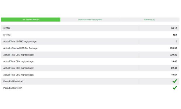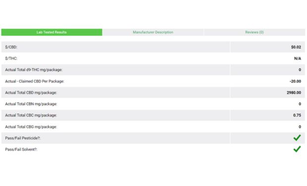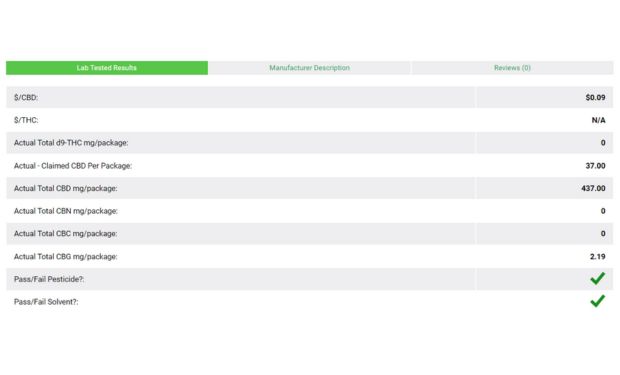 This tincture tests extremely accurately to the label claim of 400 mg of CBD. It doesn’t contain any detectable amounts of THC, but it does contain some CBDV and CBG, meaning it is a broad-spectrum CBD product. This CBD oil also passed all residual and solvent testing, and it’s reasonably priced at $0.09 per mg of CBD.