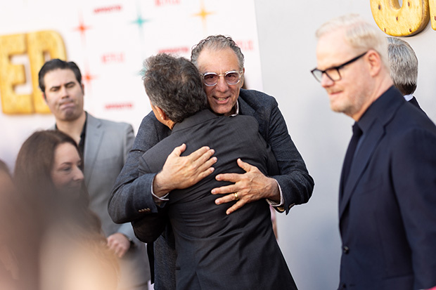 Both of the comedians sported suits for the outing. Michael sported a charcoal suit with a white button-down with a design on it. He also accessorized with a gold chain and a set of glasses. Jerry rocked an all-black suit for the event. The two of them were also seen hugging on the red carpet while the rest of the cast posed for photos together.