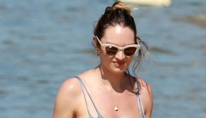 Looking like she could give birth any minute now, Candice Swanepoel flaunted her gorgeous baby bump while rocking a string bikini on the beach. We can’t believe she’s still so active this far along! See her huge belly.