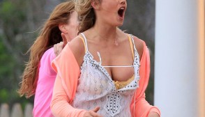 Kate Upton, 20, looks like she’s celebrating her upcoming birthday a little early while jumping up and down on the set of The Other Woman in West Hampton, Long Island on June 6. When the director told the supermodel to “bust a move,” she did just that, and busted out of her top, too! Co-star Leslie Mann doesn’t look like she noticed but the camera catches all — and we’re sure Kate’s fans didn’t mind.