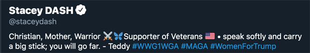 Similar to Stephen Baldwin, Stacey was an early supporter of Donald Trump. Her Twitter feed (she was “shut down on IG” in early October) is mostly filled with motivational messages and Christian biblical quotes, but she has also retweeted @TeamTrump a handful of times. Plus, her Twitter bio includes #MAGA #WomenFor Trump (and a hashtag related to the Trump-adjacent conspiracy theory, Qanon.)