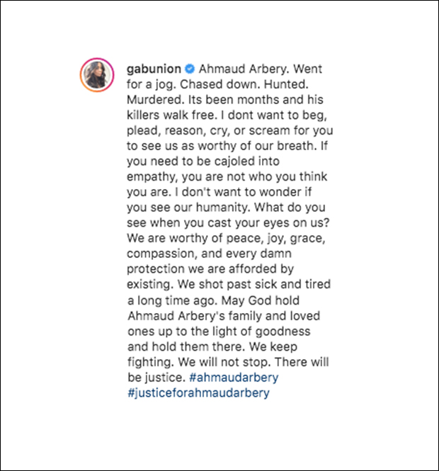 “What do you see when you cast your eyes on us?” asked Gabrielle Union. “We are worthy of peace, joy, grace, compassion, and every damn protection we are afforded by existing. We shot past sick and tired a long time ago. May God hold Ahmaud Arbery’s family and loved ones up to the light of goodness and hold them there. We keep fighting. We will not stop. There will be justice.