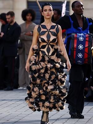 The “Firework” singer sported the beautiful dress as a marching band drummers walked behind her on the catwalk, as she participated in the fashion event.